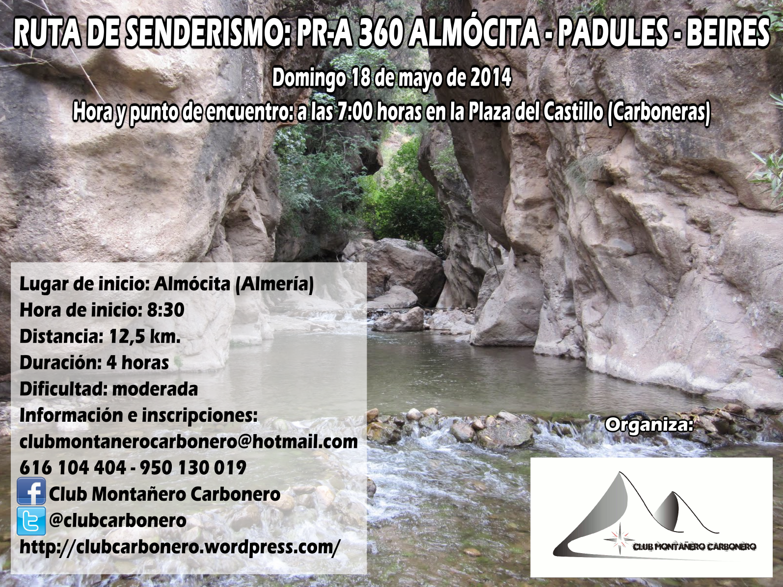El Club Montañero Carbonero organiza la ruta de senderismo PR-A 360 Almócita – Padules – Beires para el domingo día 18 de mayo de 2014. Tendrá lugar entre los municipios almerienses de Almócita, Padules y Beires.
