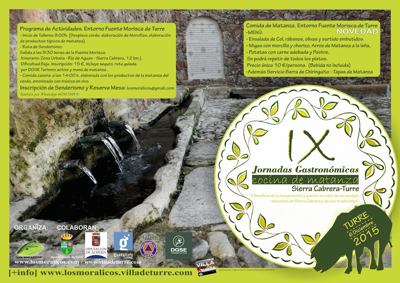 La ruta de senderismo tiene el siguiente trazado: zona urbana de Turre-Río de Aguas-Sierra Cabrera. Posee una distancia de 12 kilómetros y una dificultad baja. La cuota de inscripción es de 15 € que incluye guía, seguro temporal y menú de matanza. Esta actividad será coordinada por la DGSE Turismo Activo (www.dgseturismoactivo.com).