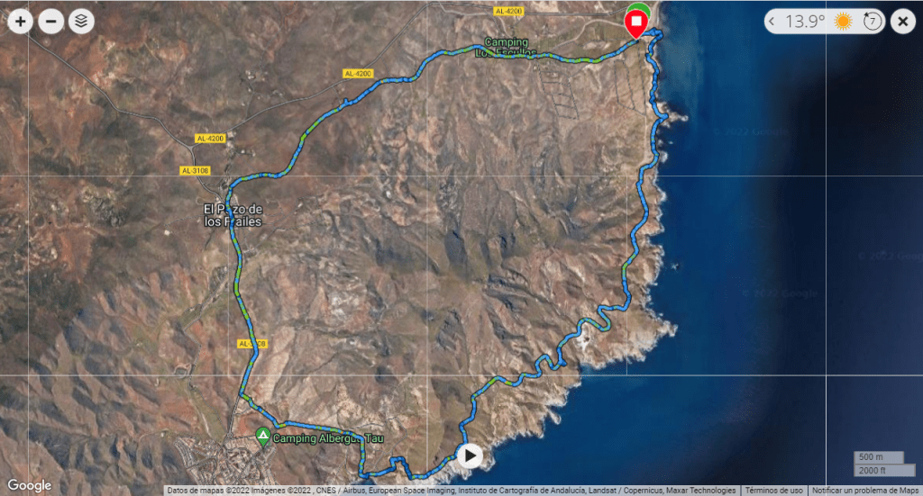 Ruta de senderismo que parte de Los Escullos, pequeño núcleo de población pegado a la Playa del Arco y custodiado por el Castillo de San Felipe. El primer tramo de la ruta bordea la costa aprovechando el sendero homologado de Loma Pelada hasta su descenso a Cala Higuera. Allí se hará una parada para reponer fuerzas y posteriormente recorreremos el camino de acceso a esta cala en para desviarse a mano y empalmar con el recién estrenado sendero peatonal que une San José con el Pozo de los Frailes. Una vez alcanzada esta última población se tomará el sendero señalizado que nos llevará hasta Los Escullos, donde finalizaremos nuestra ruta.