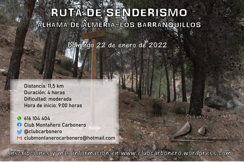 El Club Montañero Carbonero organiza el domingo 22 de enero de 2023 la ruta de senderismo Alhama de Almería-Los Barranquillos.