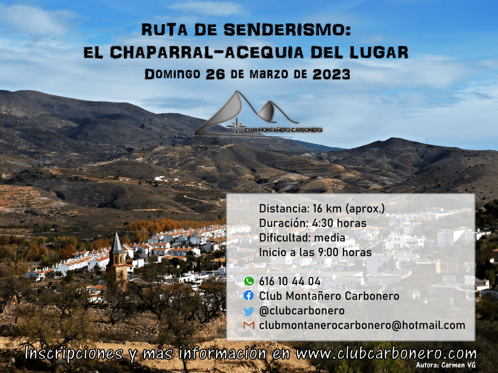 El Club Montañero Carbonero organiza el domingo 26 de marzo de 2023 la ruta de senderismo El Chaparral-Acequia del Lugar.