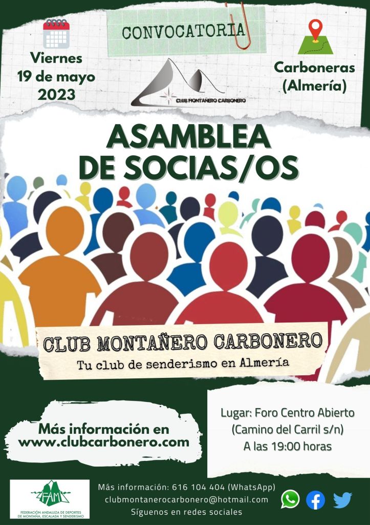 El Club Montañero Carbonero convoca Asamblea General Extraordinaria para el viernes 19 de mayo de 2023 a las 19:00 horas en el Centro Foro Abierto (Camino del Carril s/n, junto Colegio de Educación Primaria «San Antonio de Padua») de Carboneras (Almería). Es una asamblea abierta a la participación de socias/os y simpatizantes.