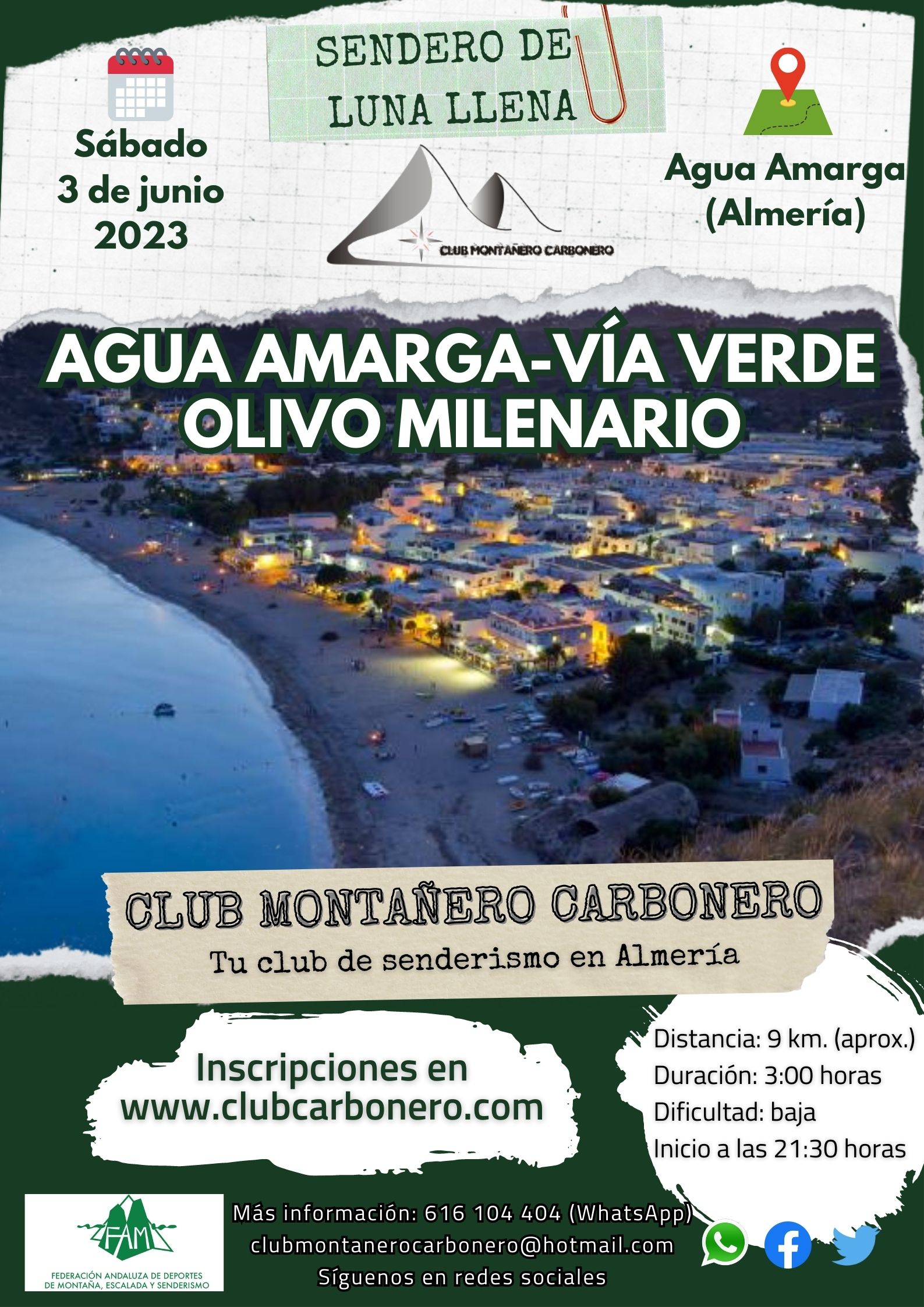 El Club Montañero Carbonero organiza el sábado 3 de junio de 2023 el sendero de luna llena Agua Amarga-Vía Verde-Olivo Milenario.