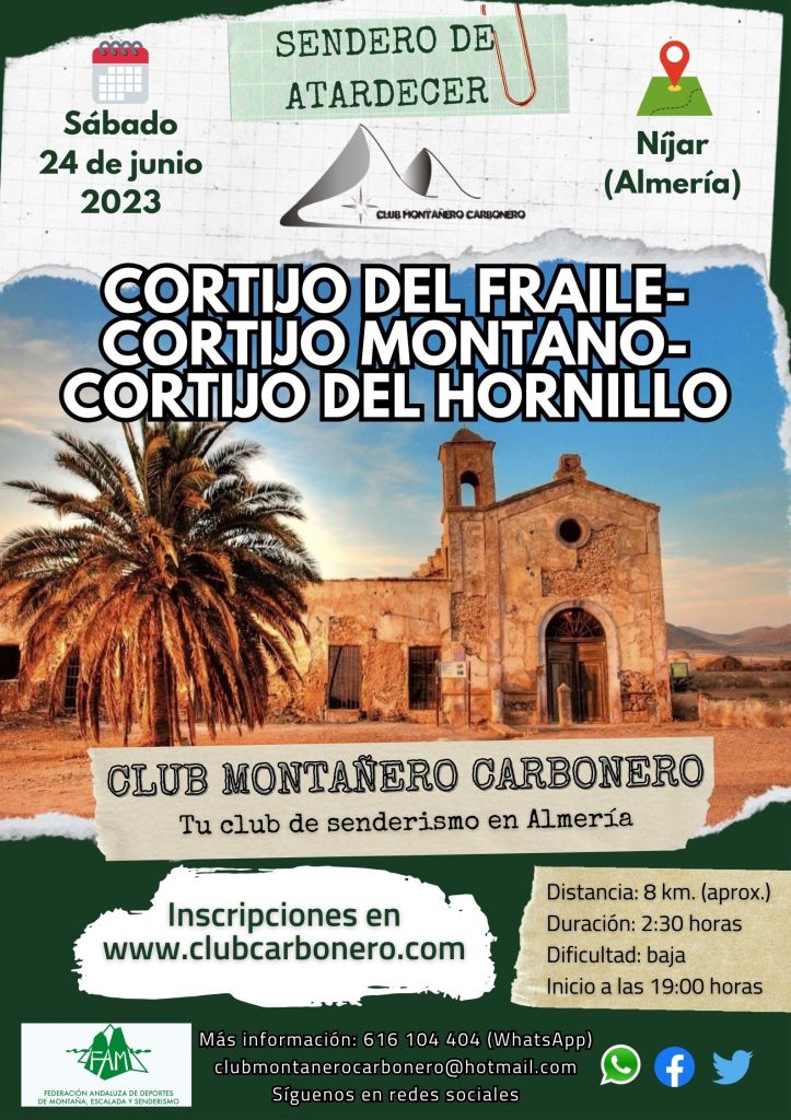 El Club Montañero Carbonero organiza el sábado 24 de junio de 2023 el sendero de atardecer Cortijo del Fraile-Cortijo Montano-Cortijo del Hornillo.