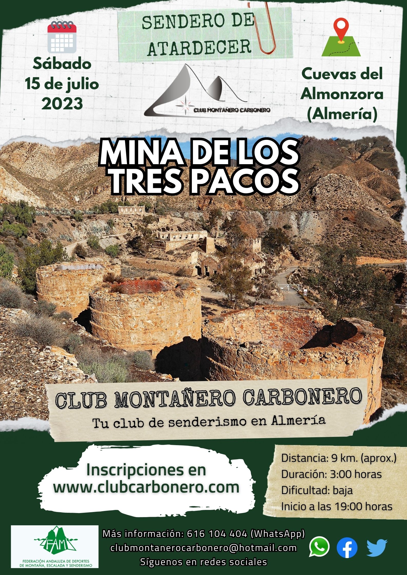 El Club Montañero Carbonero organiza el sábado 15 de julio de 2023 el sendero de atardecer Mina de los Tres Pacos.
