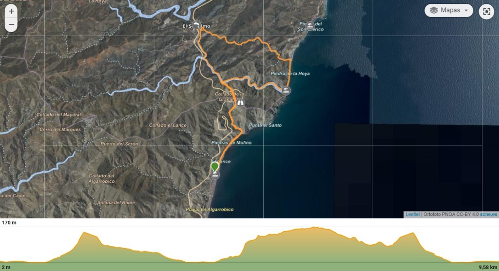 Se inicia el recorrido en la Playa del Algarrobico junto al polémico hotel. Seguiremos la línea costera hasta las Piedras del Molino por el antiguo camino que unía Carboneras con Mojácar. Una vez alcanzado este punto, tomaremos un sendero que nos lleva por un barranco a los pies del Cortijo de la Parrica y llegaremos a un túnel que cruzaremos y ya nos encontraremos en la Rambla de la Granatilla. Aquí nos dirigiremos hacia la desembocadura de la rambla que forma una pequeña playa. Haremos una parada para reponer fuerzas y reanudaremos la marcha siguiendo la línea de la costa por la Piedra de la Hoya. Más adelante, nos desviaremos a nuestra izquierda y remontaremos un pequeño tramo de barranco hasta girar a nuestra derecha y empezar a ganar altura mediante un sendero. Este nos llevará al Barranco de los Moros. Una vez alcanzado este, lo remontaremos hasta llegar a Sopalmo. Aquí iniciaremos una fuerte pendiente de bajada por una pista cementada hasta alcanzar la Rambla de la Granatilla. Estando en ella, descenderemos buscando la desembocadura hasta encontrarnos a nuestra derecha el túnel por el que salimos. Desde aquí ya solo nos queda deshacer nuestros pasos hasta el que fue el punto de salida.