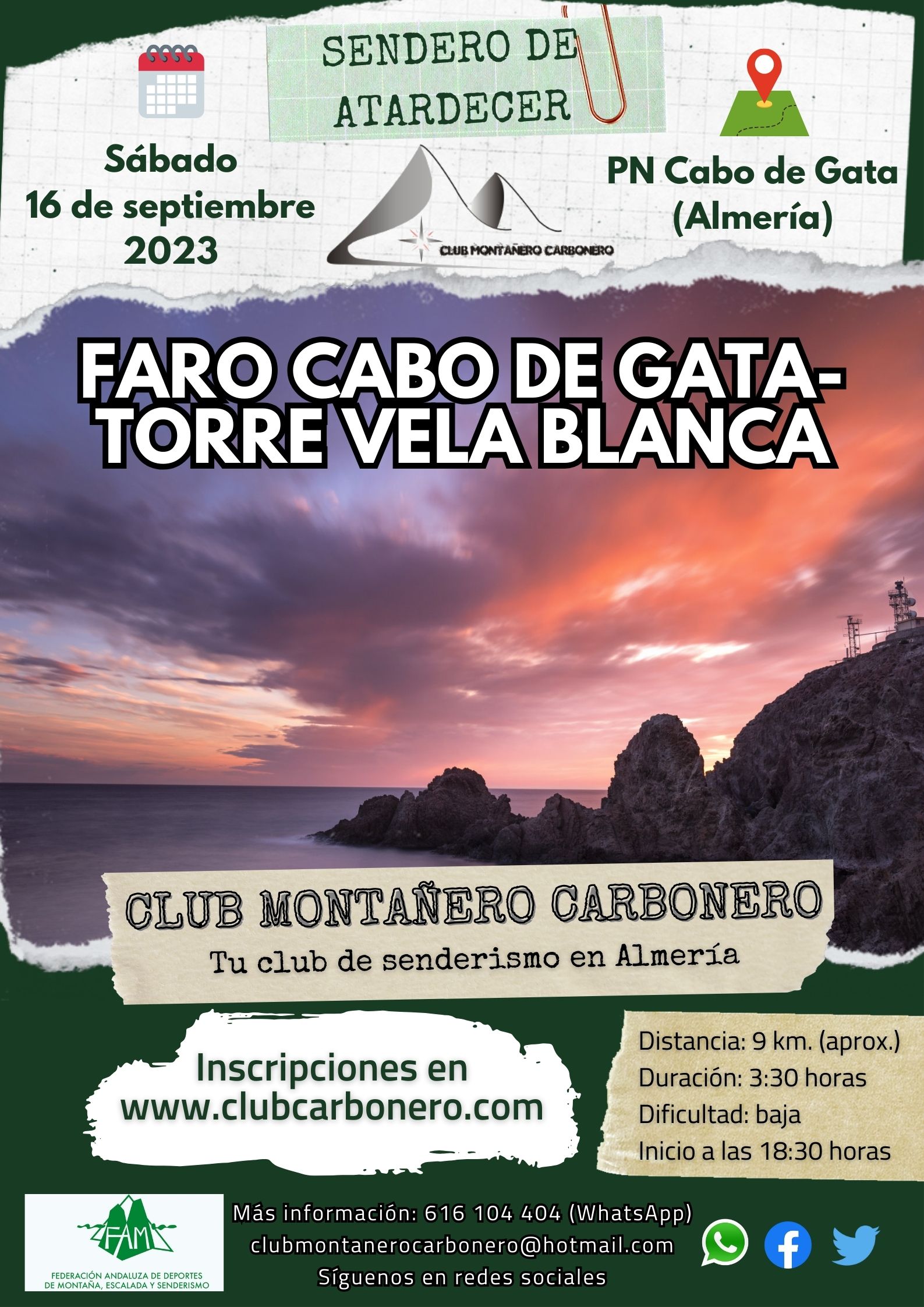 El Club Montañero Carbonero organiza el sábado 16 de septiembre de 2023 el sendero de atardecer Faro del Cabo de Gata-Torre de la Vela Blanca.