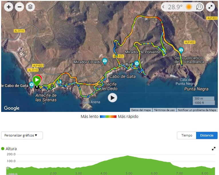 Este sendero parte del aparcamiento del Faro de Cabo de Gata y atraviesa toda la línea costera hasta ascender a la Torre de la Vela Blanca pasando por el Arrecife de las Sirenas, Cala Arena y Cala Rajá. Usaremos pequeños senderos en los que podremos contemplar la vegetación típica del Parque Natural así como formaciones geológicas curiosas. El ascenso hasta la torre vigía lo tomaremos a través de una pista de asfalto. Un vez allí, haremos una parada para reponer fuerzas. Reanudaremos la marcha deshaciendo camino y optaremos por descender utilizando una pista de tierra que nos llevará con un abrupto sendero hasta una carretera. Desde aquí, buscaremos el trazado de ida para alcanzar nuestro punto final.