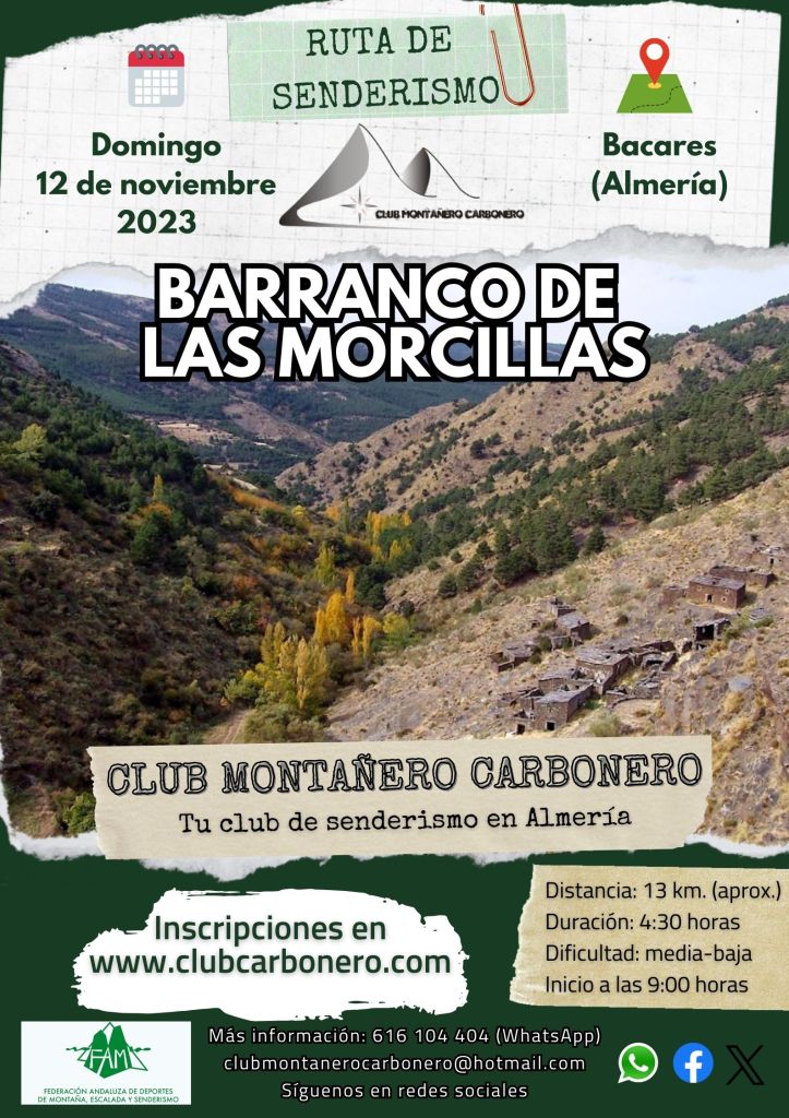 El Club Montañero Carbonero organiza el domingo 12 de noviembre de 2023 la ruta de senderismo Barranco de Las Morcillas.