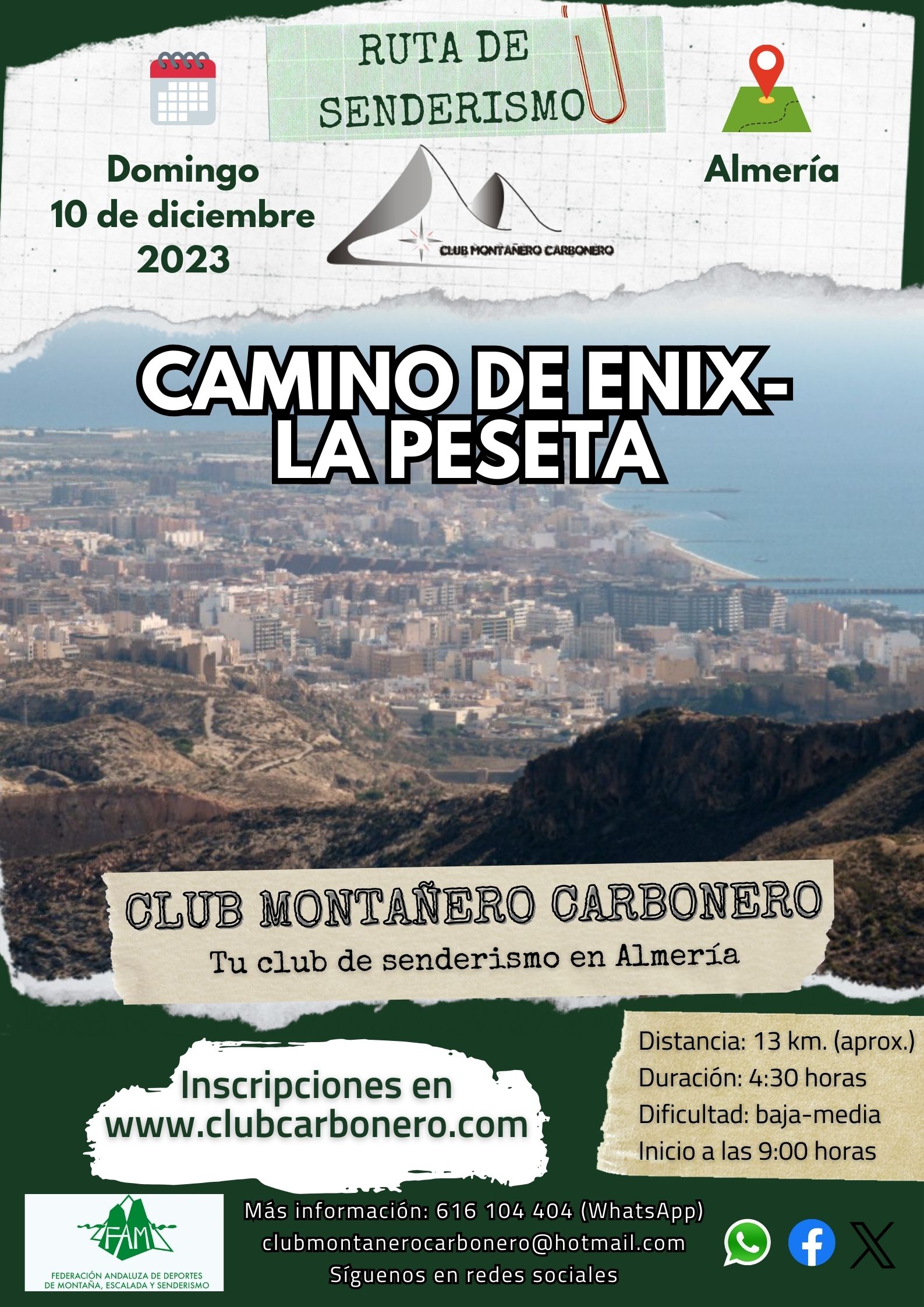 El Club Montañero Carbonero organiza el domingo 10 de diciembre de 2023 la ruta de senderismo de Camino de Enix-La Peseta.
