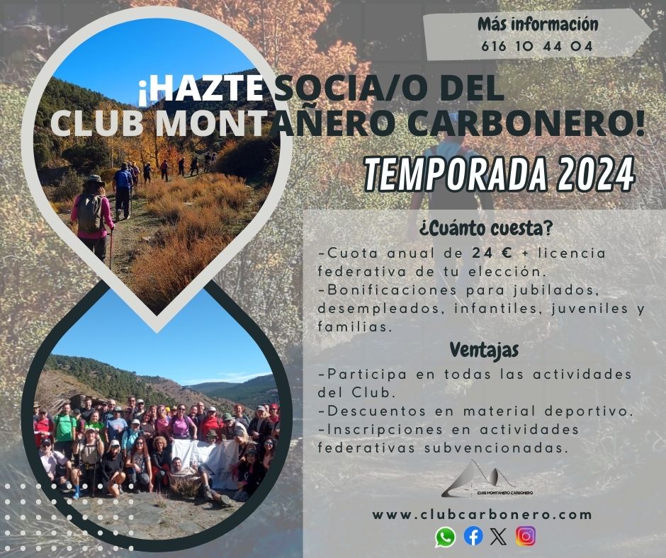 El Club Montañero Carbonero abre la campaña de socias y socias correspondiente a la temporada 2024 así como la solicitud de licencias federativas de la Federación Andaluza de Deportes de Montaña, Escalada y Senderismo (FADMES) y la Federación Española de Deportes de Montaña y Escalada (FEDME) que entrarán en vigor el próximo año. Pretendemos continuar con el crecimiento en socias y socias de la temporada que va a finalizar, proponernos nuevos objetivos más ambiciosos, alcanzar nuevas metas con ánimos renovados y seguir incrementando el prestigio de un club deportivo que ansía llevar su nombre hasta el último rincón de la provincia de Almería.