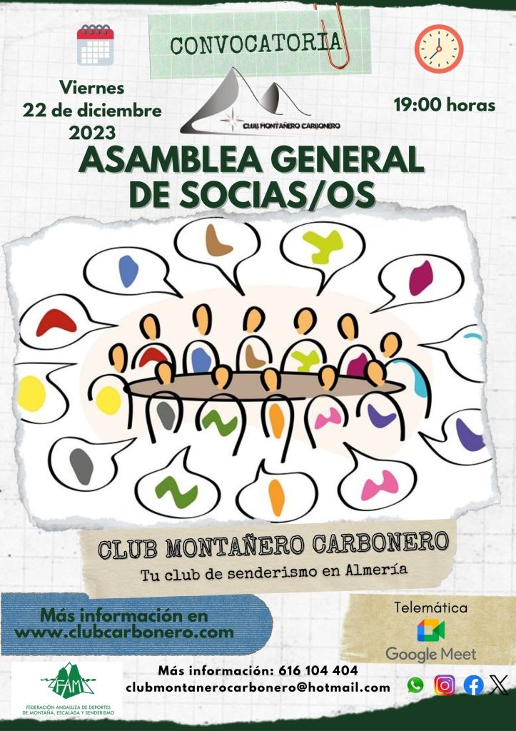 El Club Montañero Carbonero convoca Asamblea General para el viernes 22 de diciembre de 2023 a las 19:00 horas en primera convocatoria y a las 19:15 horas en segunda convocatoria. La citada reunión se realizará vía telemática mediante videoconferencia a través servicio de Google Meet. Se iniciará la videoconferencia a las 18:45 horas y las personas que deseen unirse deben pulsar el enlace que se facilita a continuación: https://meet.google.com/ood-qhcx-pjn