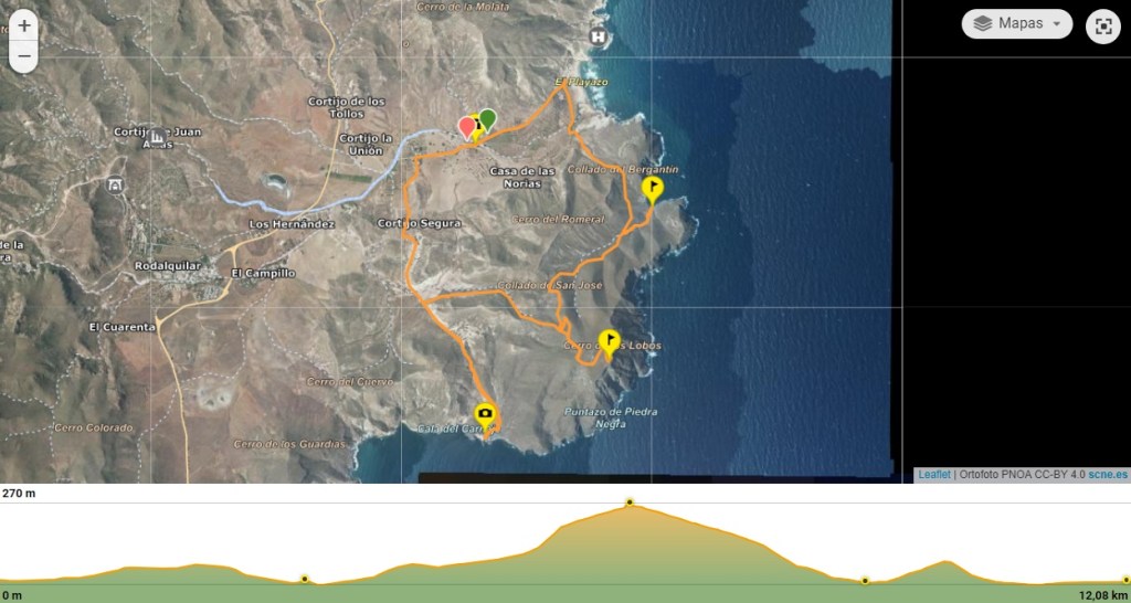 Ruta de senderismo que parte del Playazo de Rodalquilar para avanzar por la Rambla del Playazo dejando a su paso varias norias, molinos y cortijos. Más adelante, se interna hacia la izquierda buscando la pista de tierra que nos lleva hasta Cala Carnaje obteniendo una espectacular panorámica de la Isleta del Moro, Los Escullos y el Pico del Fraile. Desde allí se iniciará posteriormente el ascenso hasta la Torre de los Lobos, convertida hoy día en un faro. Descenderemos para adentrarnos en el Barranco del Bergantín y llegar en su desembocadura a la Cala del Bergantín. Tras visitar esta cala de bolos, andaremos los últimos kilómetros hasta el Playazo de Rodalquilar.