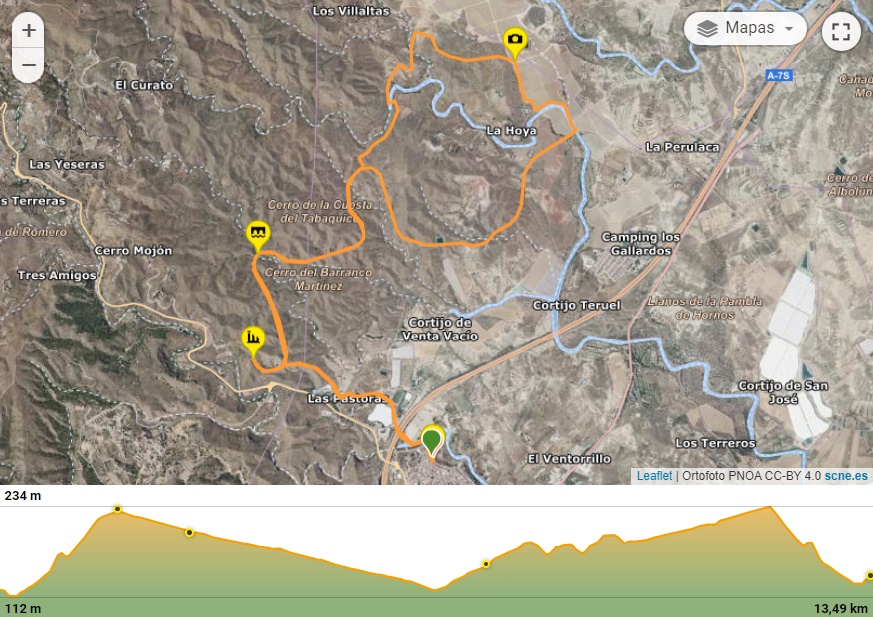 Desde el parking del campo de fútbol tomaremos una antigua vía pecuaria que cruza la barriada de Las Pastoras. Esta vía pecuaria convertida en camino de tierra nos llevará hasta el antiguo trazado del tren minero de Tres Amigos-Garrucha. A lo largo de esta vía podremos observas las construcciones típicas de trazados ferroviarios como puentes, almacenes, apeaderos, etc.