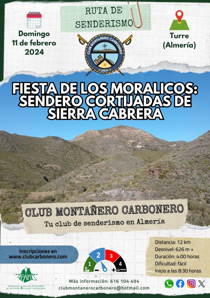 El Club Montañero Carbonero en colaboración con la Asociación de Vecinos «Los Moralicos» organiza el domingo 11 de febrero de 2024 la ruta de senderismo Cortijadas de Sierra Cabrera.