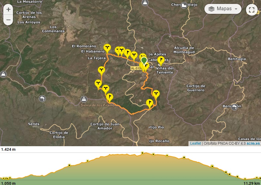 A un kilómetro aproximadamente cruza de nuevo la Ctra. A-349, cerca de la gasolinera de Tahal, y sigue otra vez por el Camino del Berro hasta llegar a la Ctra. de Benitorafe, donde se desvía a la derecha y la recorre medio kilómetro aproximadamente hasta llegar al punto de inicio en Tahal.