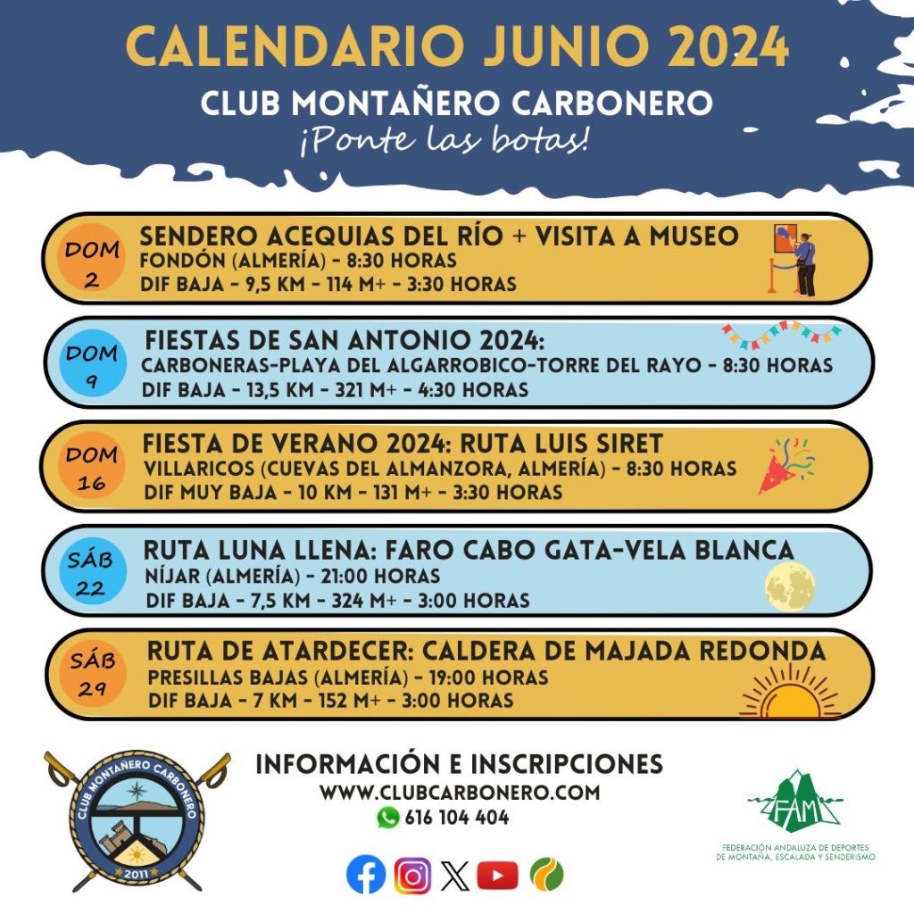Desde el Club Montañero Carbonero queremos informar del calendario de actividades para el mes de junio de 2024.