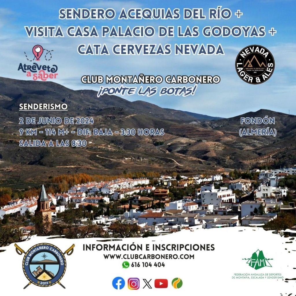 El Club Montañero Carbonero organiza el domingo 2 de junio de 2024 la ruta de senderismo Acequias del Río + Visita Casa Palacio de las Godoyas + Cata Cervezas Nevada.