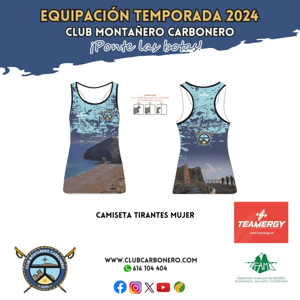 El Club Montañero Carbonero va a ampliar la nueva equipación y tenemos disponible para su reserva camisetas de tirantes para mujer con el mismo diseño del resto de artículos (camiseta de manga corta, camiseta de manga larga y cortavientos) que tanto ha gustado. La ponemos a disposición de nuestras socias/os así como de cualquier persona que desee hacerse con ella y poder llevarla en sus rutas de senderismo. Para ello, vamos a habilitar un formulario de reserva. Una vez finalizado el plazo de reserva, el próximo jueves día 30 de mayo de 2024, procederemos a hacer el pedido. En cuanto lo recibamos, os haremos entrega de vuestras prendas en nuestras actividades o podréis retirarlas en nuestro local.