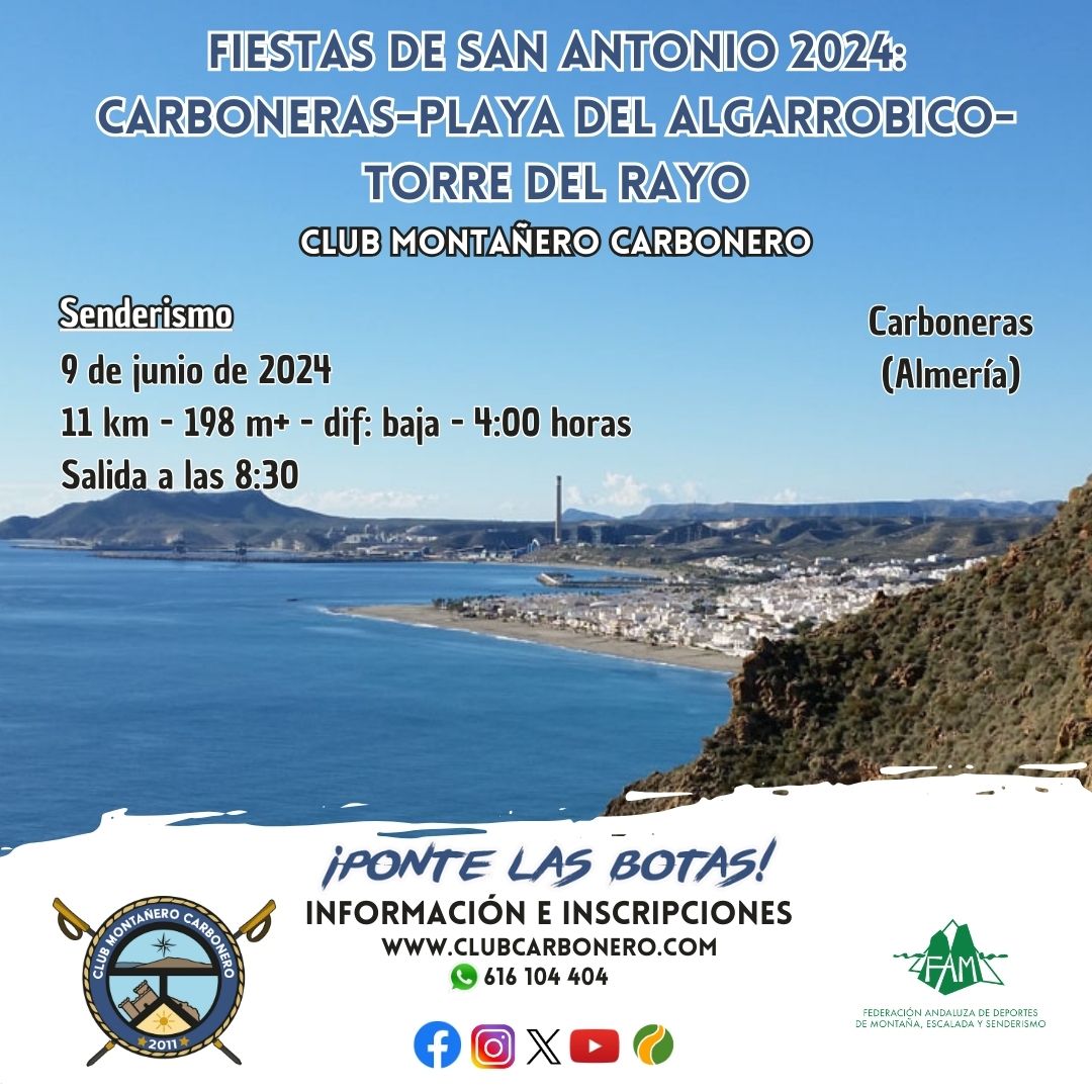 El Club Montañero Carbonero organiza el domingo 9 de junio de 2024 la ruta de senderismo Carboneras-Playa del Algarrobico-Torre del Rayo con motivo de las Fiestas de San Antonio 2024.