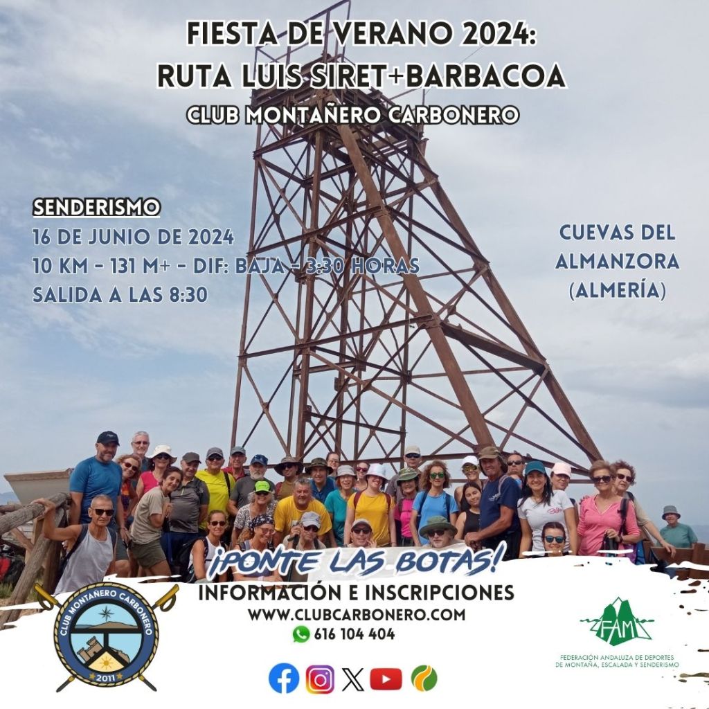 El Club Montañero Carbonero organiza el domingo 16 de junio de 2024 su Fiesta de Verano 2024. Incluye la ruta de senderismo Luis Siret que partirá del Castillo de Villaricos además de un acto de entrega de obsequios y una barbacoa que a celebrar en el Club Naútico Almanzora (Playa de Quitapellejos, Cuevas del Almanzora).