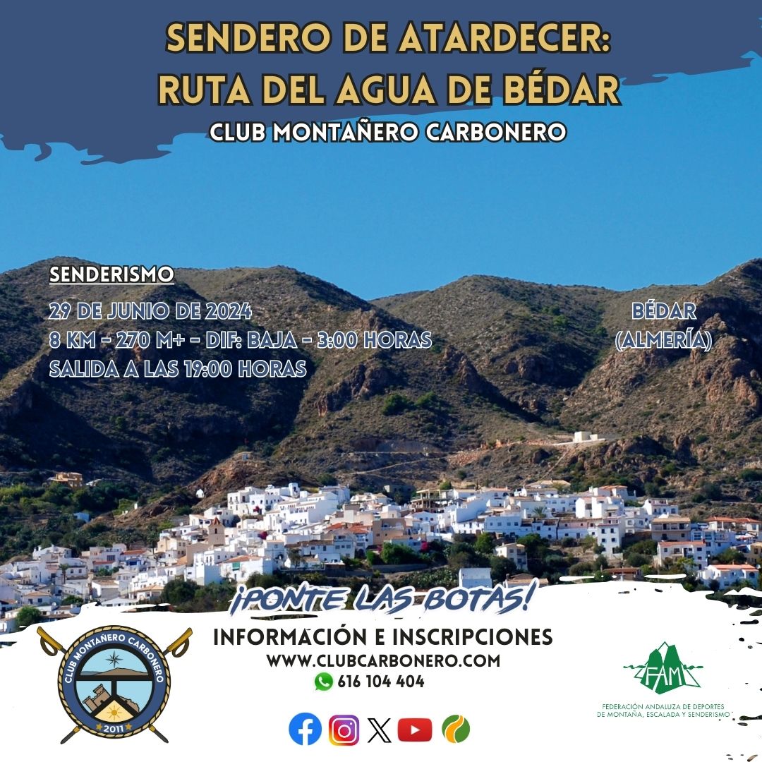 El Club Montañero Carbonero organiza el sábado 29 de junio de 2024 el sendero de atardecer de la Ruta del Agua de Bédar.
