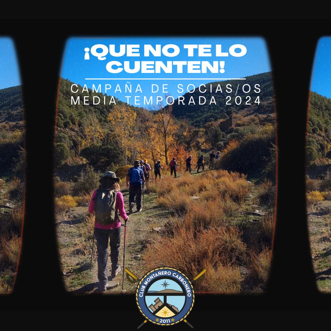 El Club Montañero Carbonero abre su campaña de socias y socios correspondiente a la Media Temporada 2024. La Federación Andaluza de Deportes de Montaña, Escalada y Senderismo (FADMES) permite la tramitación de algunas modalidades de licencias federativas desde el día 24 de junio de 2024 en formato de media temporada que estarán vigentes desde el día 1 de julio de 2024. Estas tienen un coste económico inferior con respecto a las de temporada completa. Y el Club Montañero Carbonero va a adaptar su cuota de socia/o a un importe proporcional a la altura de la temporada en la que nos encontramos.
