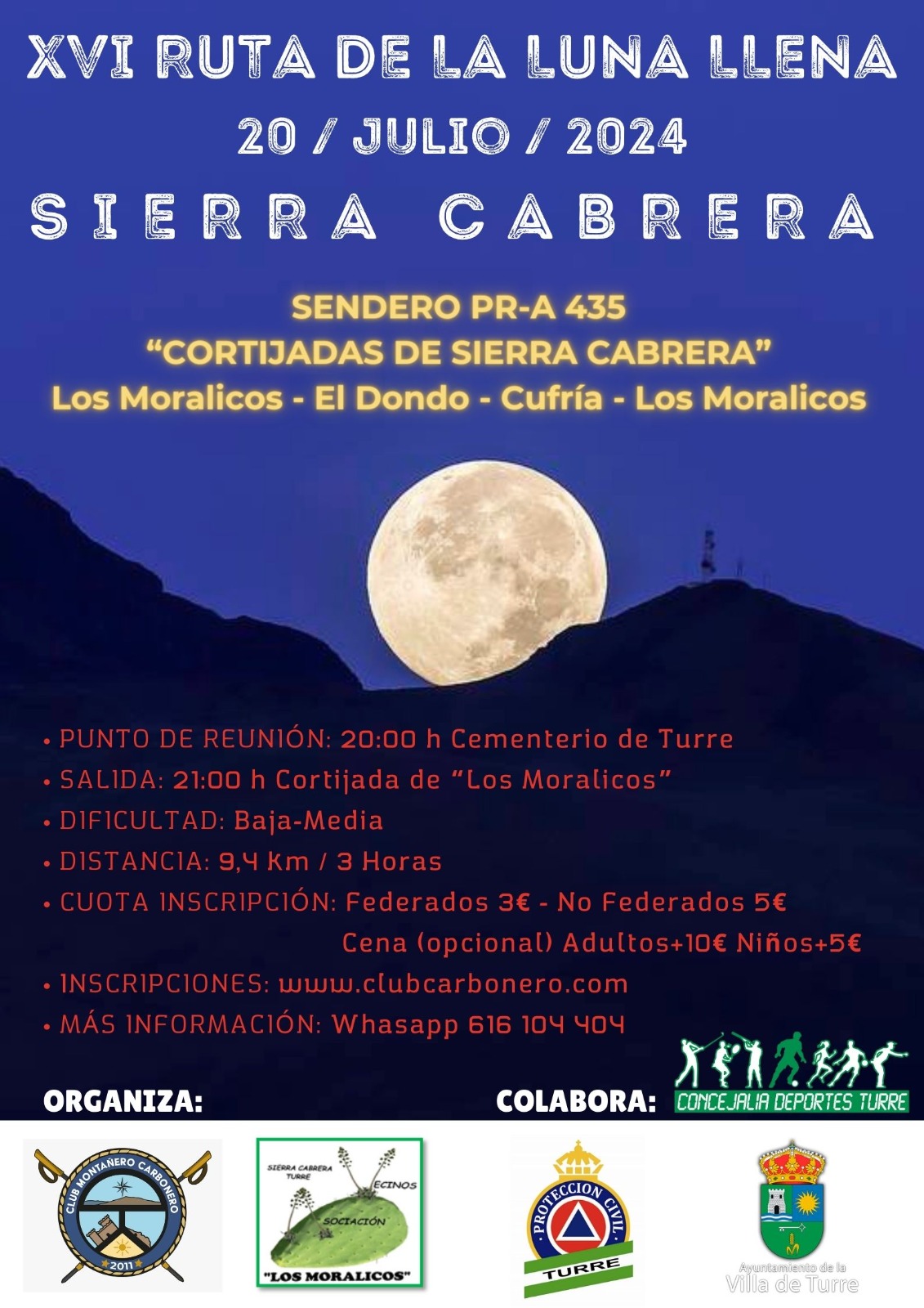 La Asociación de Vecinos «Los Moralicos» y el Club Montañero Carbonero organizan el sábado 20 de julio de 2024 la XVI Ruta de Luna Llena de Sierra Cabrera.
