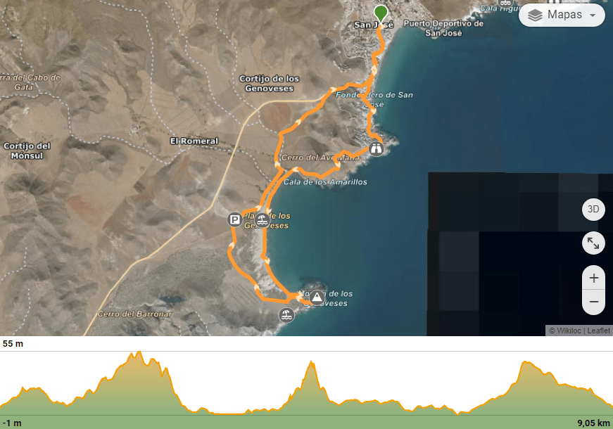 Esta ruta de atardecer parte de la Plaza Génova de San José y avanza las calles de su casco urbano buscando el mar por la Calle Correo todo recto hasta alcanzar la Calle la Calilla y la playa del mismo nombre. Si seguimos dicha calle llegaremos hasta el Mirador del Sollarete. Tras hacer una parada allí, continuamos nuestra marcha y alcanzamos un segundo mirador con una vistas maravillosas de la Playa de los Genoveses. A partir de este punto se acaba la calle y se transforma en una pista de tierra que unos cientos de metros más allá desemboca en un sendero. Éste nos llevará directamente a la arena de la Playa de los Genoveses. Allí atravesaremos este playa de punta a punta por su orilla. En el otro extremo, haremos un ascenso hasta subir al Morrón de los Genoveses. Bajamos desde el Morrón y caminaremos entre dunas de arena hasta alcanzar el parking de la Playa de los Genoveses. Pasaremos al lado de un búnker de la Guerra Civil Española y cogeremos un tramo de sendero que nos llevará al Molino del Cerro del Ave María. Seguimos avanzando por una pista de tierra hasta llegar a una caseta de control y entraremos de nuevo en el casco urbano de San José. Callejeamos y finalizaremos en el que fue nuestro punto de salida: Plaza Génova.