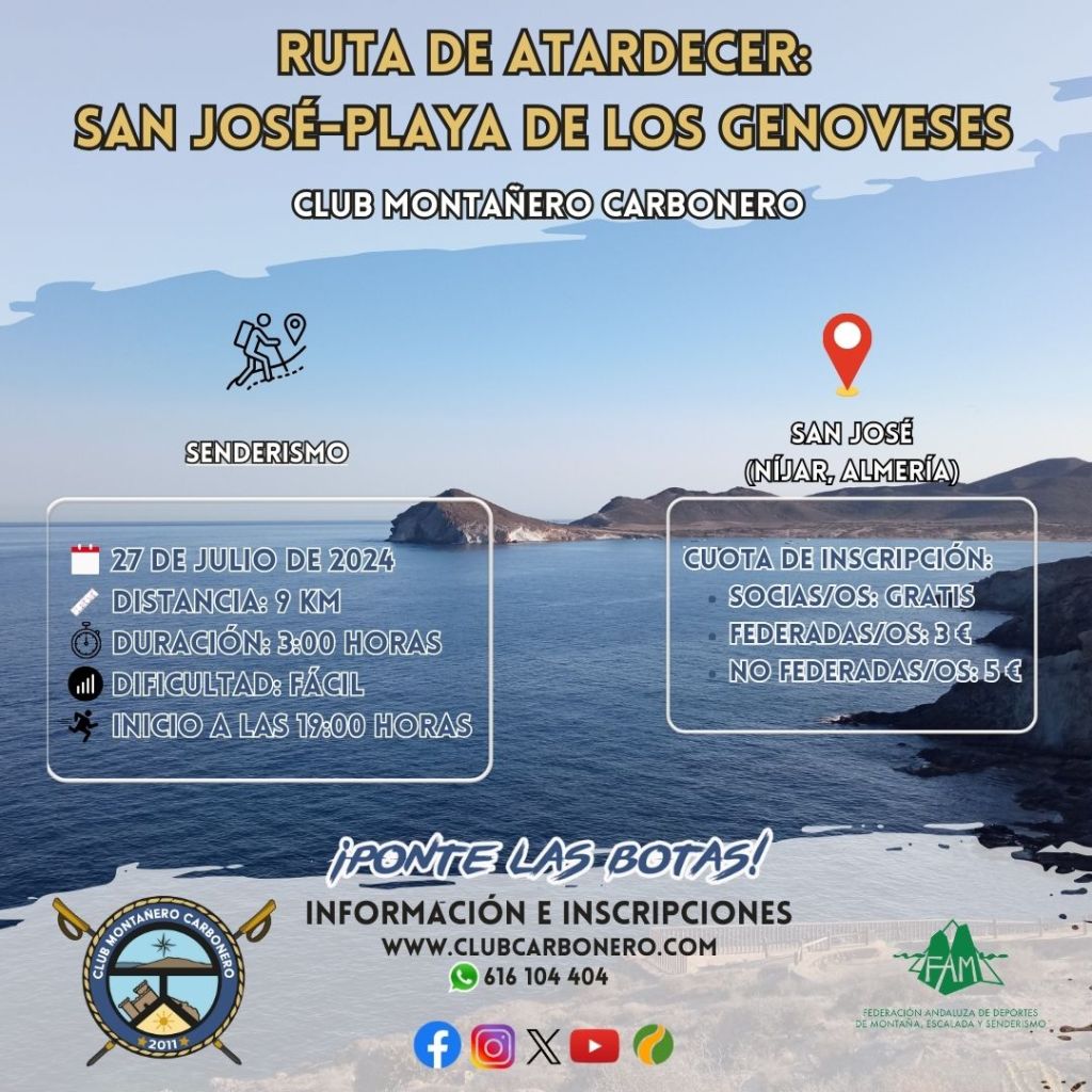 El Club Montañero Carbonero organiza el sábado 27 de julio de 2024 la ruta de atardecer San José-Playa de los Genoveses.