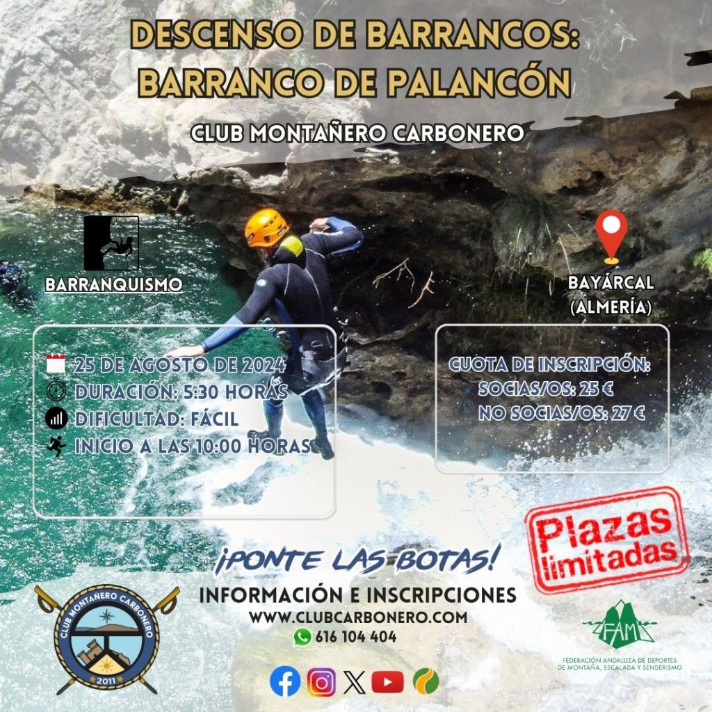 El Club Montañero Carbonero organiza el domingo 25 de agosto de 2024 el descenso de barrancos en el Barranco de Palancón.