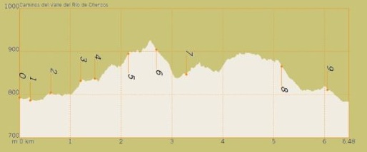 El punto de partida del sendero es el Olivo existente al comienzo del camino al Paraje de El Soto (0) continuando en dirección al puente teniendo que cruzarse. Una vez cruzado se toma a la izquierda el Camino de La Esperilla (1). Tras un corto trayecto el camino se estrecha a senda, llegando a un cruce de caminos (2), y se continúa por el Sendero principal hasta La Viñilla (3). Después de atravesar una era, hay que continuar hasta la pista asfaltada, que se dirige hacia Las Paletas (4), teniendo la opción de llegar a El Cercado, a la izquierda, o tomar el Sendero principal, a la derecha, que se dirige hacia Chercos Viejo. Remontando el río por su margen occidental se llega a una flecha que invita a desviarse hacia la Piedra Labrá (5), pudiendo visitarse. Continúa el sendero cruzando el Barranco de Los Allagares para así llegar a Chercos Viejo por el Camino del Cementerio. Se cruza la localidad pasando junto a la Iglesia de Santa María y se sigue bajando por la Calle Estación hasta llegar a una Plaza Balconada (6) en la que se ofrece visitar las Eras del Calvario o seguir hasta El Cercado por la calle Empedrá. El sendero prosigue por el antiguo camino de Cóbdar, cruza el río y a continuación llega a la pedanía de El Cercado (7), donde se encuentra de nuevo con la variante que venía de Las Paletas. Para continuar la ruta hay que ascender por la pista asfaltada hasta divisar una senda saliendo por la izquierda. Se trata de nuevo del secular Camino de Cóbdar a Chercos, que atraviesa un encinar característico de la Umbría de la Sierra de Los Filabres. Una vez llegados a la Yesera (8), una flecha invita a acercarse a verla antes de dirigirse al Paraje de El Soto (9) atravesándolo por una pista asfaltada que pasa junto a la Fuente de El Soto, y que lleva hasta el olivo donde se sitúa el punto de partida del sendero (0).