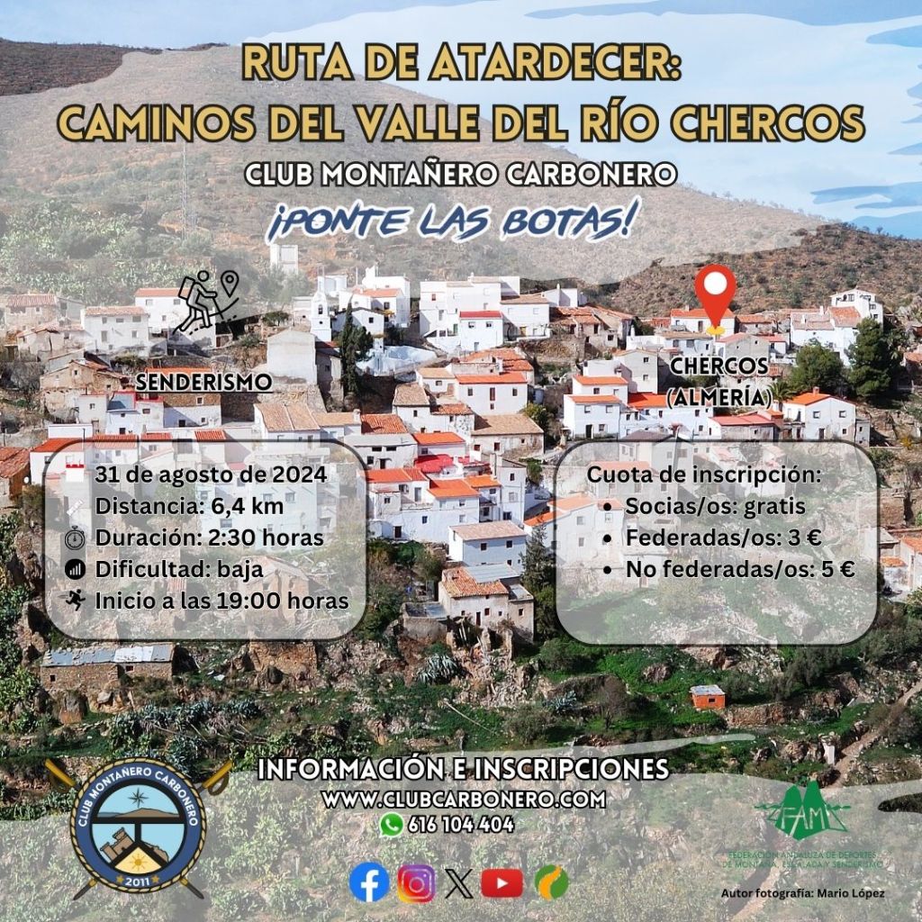 El Club Montañero Carbonero organiza el sábado 31 de agosto de 2024 la ruta de atardecer Caminos del Valle del Río Chercos.