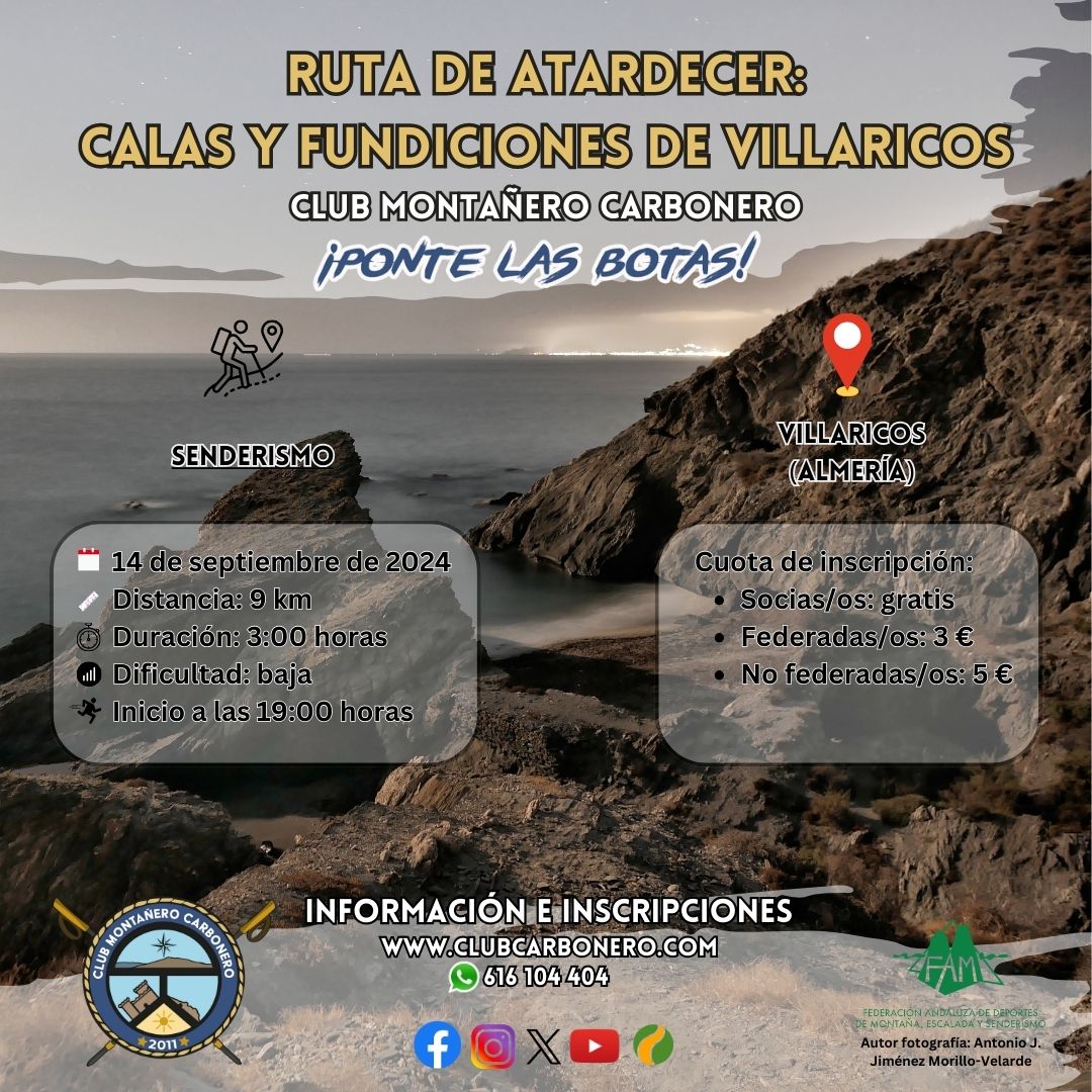 El Club Montañero Carbonero organiza el sábado 14 de septiembre de 2024 la ruta de atardecer Calas y Fundiciones de Villaricos.