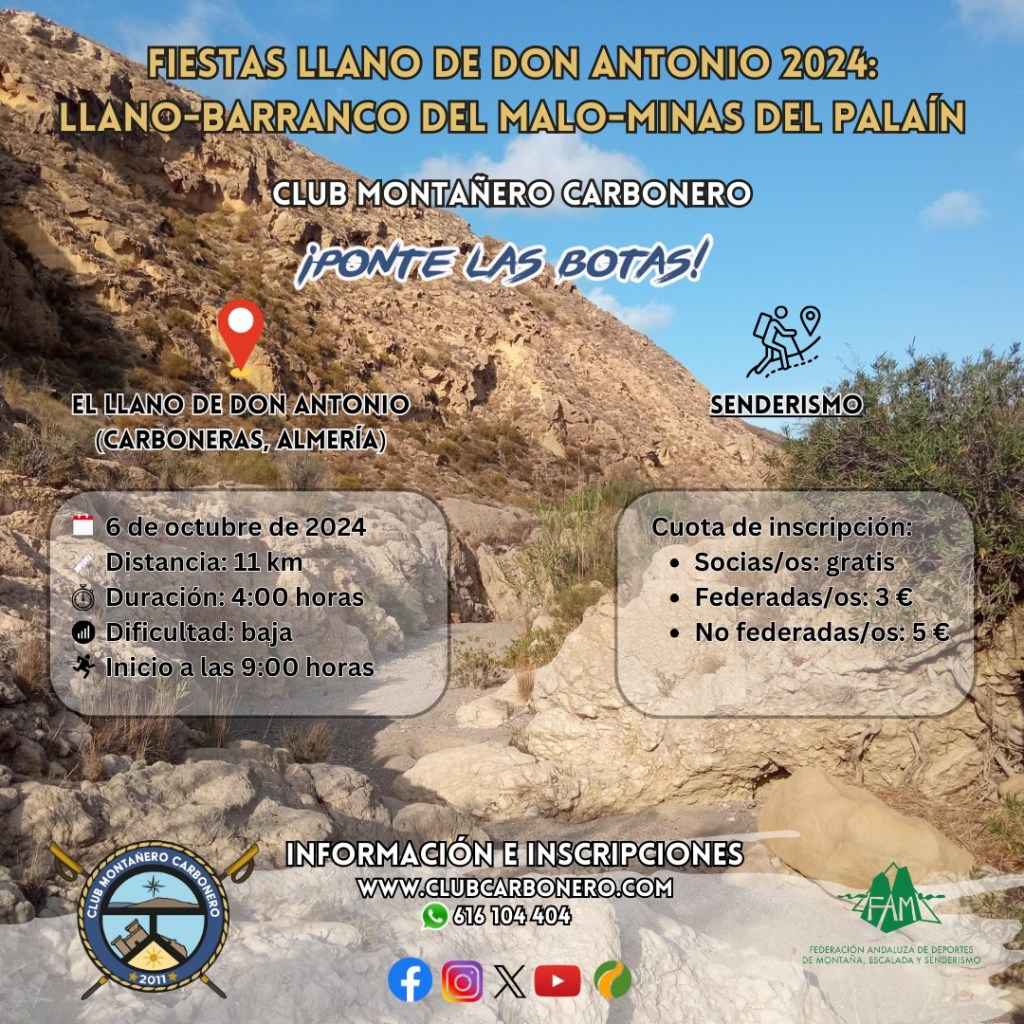 - Si no eres socia/o, para confirmar la inscripción, es obligatorio enviar un justificante/recibo de abono de la cuota de inscripción y de tu licencia federativa (si la tuvieras) al número de teléfono 616104404 (WhatsApp) o al correo electrónico clubmontanerocarbonero@hotmail.com