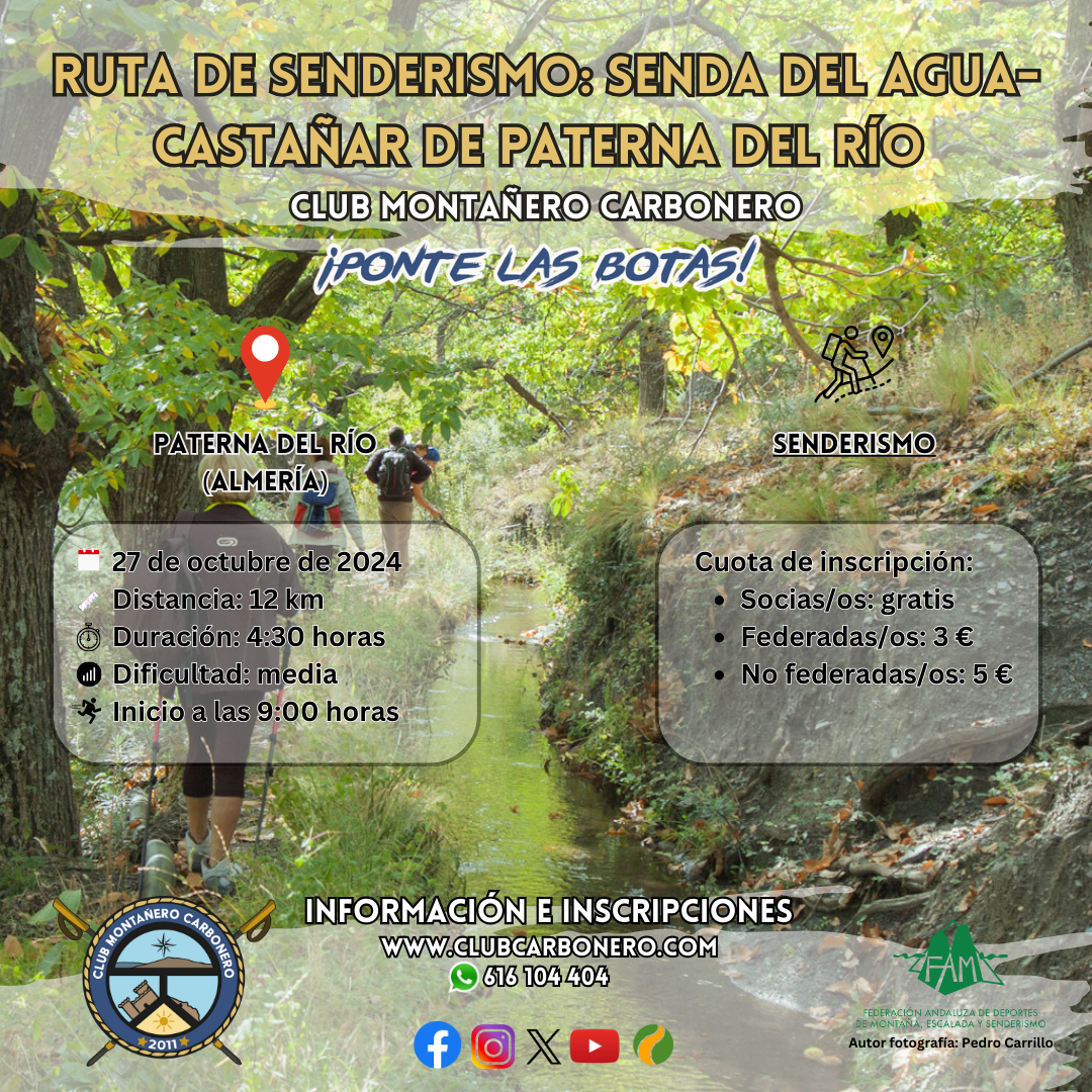 El Club Montañero Carbonero organiza el domingo 27 de octubre de 2024 la ruta de senderismo Senda del agua-Castañar de Paterna del Río.