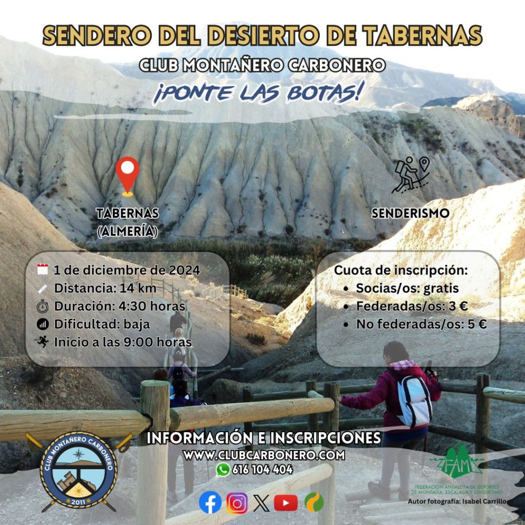 El Club Montañero Carbonero organiza el domingo 1 de diciembre de 2024 la ruta de senderismo Sendero del Desierto de Tabernas.