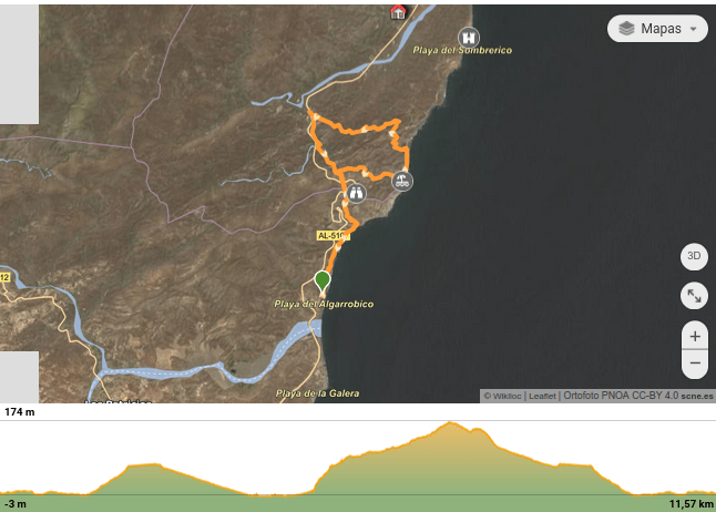 La ruta de senderismo será Algarrobico-Granatilla-Sopalmo. Tiene su punto de inicio junto al polémico hotel ubicado en la Playa del Algarrobico. Desde allí arrancarán nuestros pasos para recorrer esta playa en dirección Norte. Primero caminando paralelo al mar por una pista de asfalto y luego por un sendero que corresponde al antiguo camino que unía Carboneras con la vecina localidad de Mojácar. Al finalizar la Playa del Algarrobico comenzaremos a remontar un barranco que sale a nuestra izquierda hasta alcanzar un túnel de unos 300-400 metros. A la salida del túnel nos encontramos con la Rambla de la Granatilla por la que descendemos buscando la playa en la que desemboca. Al llegar a la orilla giraremos a mano izquierda y seguiremos caminando pegados a la playa hasta alcanzar la Piedra de la Hoya. Allí nos desviamos a la izquierda y buscamos un barranco. Unos metros más adelante nos saldrá un pequeño sendero estrecho que empezará a subir en zigzag hasta llegar a un collado en el que enlazaremos la Ruta del Argar. Allí giramos a nuestra izquierda y continuaremos por un sendero primero y luego por un camino que nos llevará hasta Sopalmo. Una vez allí haremos una fuerte bajada por una pista de hormigón hasta alcanzar la Rambla de la Granatilla. Seguimos el curso de ésta hasta encontrar la salida del túnel a nuestra derecha. Desde aquí desharemos el trazado que hicimos al principio hasta finalizar junto al hotel del Algarrobico.
