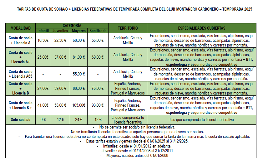 La vigencia de afiliación al Club Montañero Carbonero comprenderá desde el 1 de enero al 31 de diciembre de 2.025, a excepción de las socias/os de media temporada y temporada de otoño. Y la vigencia de las licencias federativas de temporada completa abarcará el mismo periodo temporal. Como la temporada anterior, podemos tramitar estas licencias federativas ya no solo a nivel autonómico sino también a nivel nacional, europeo y mundial con habilitación de la Federación Española de Deportes de Montaña y Escalada (FEDME).