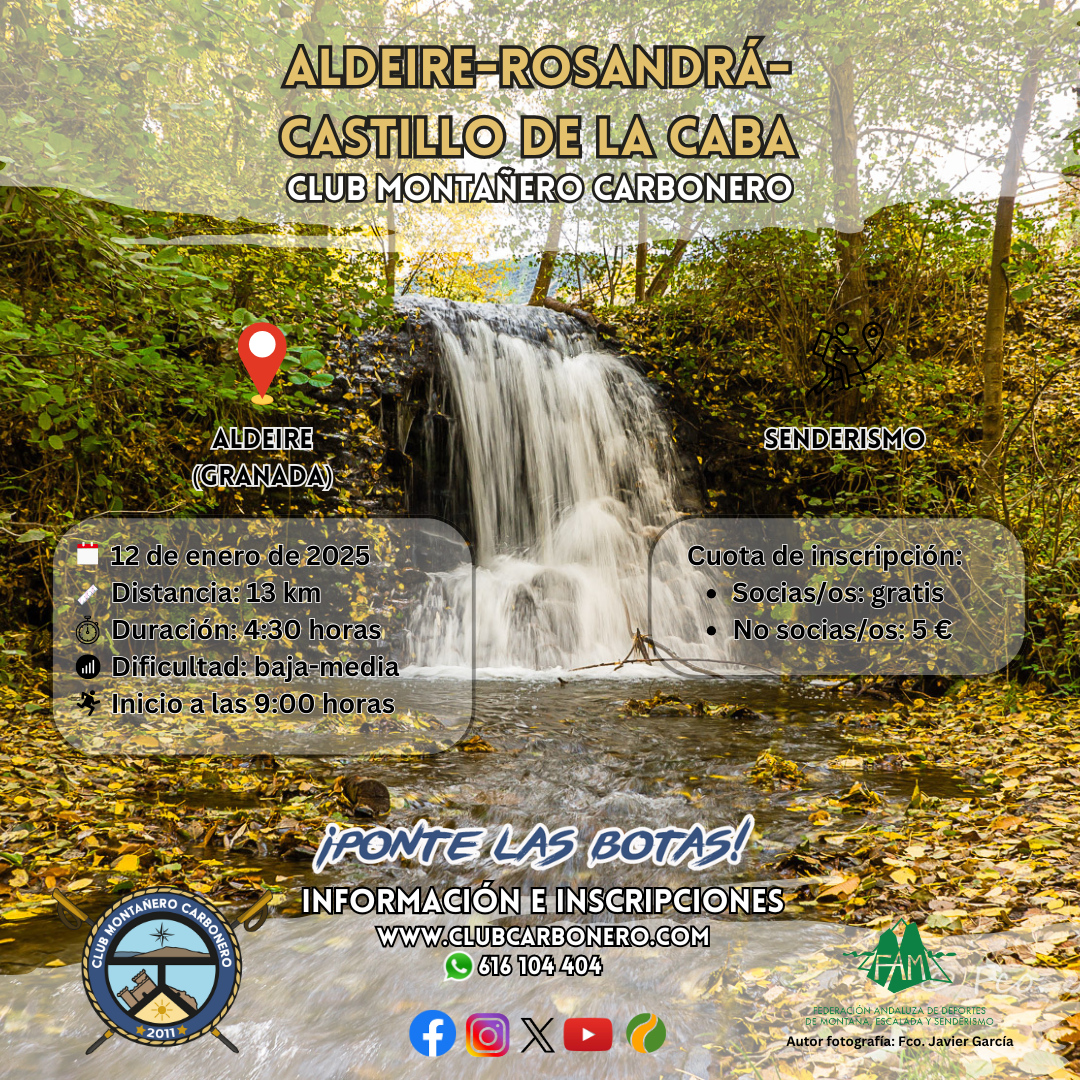 El Club Montañero Carbonero organiza el domingo 12 de enero de 2025 la ruta de senderismo Aldeire-Rosandrá-Castillo de la Caba.