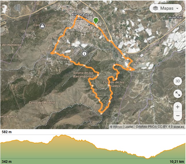 Ruta de senderismo que se inicia en la entrada de la localidad de Alhama de Almería y que callejea dentro de su casco urbano pasando por su iglesia y ayuntamiento hasta salir a las afueras. Por una pista de asfalto llegaremos a Las Balsillas y allí cogeremos un sendero que nos llevará entre un denso pinar. Abandonaremos dicho pinar en el Barranco del Serbalillo para meteremos en su cauce y lo seguiremos hasta llegar a La Puente. Desde allí buscaremos una pista de cemento que nos llevará hasta el que fue el punto inicial de la ruta y se dará por concluida la actividad.