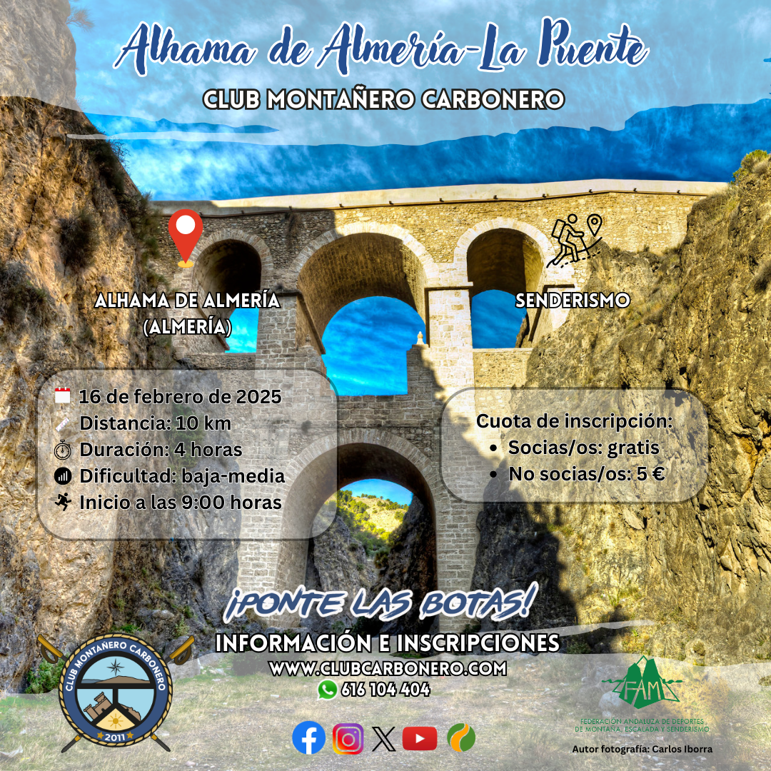 El Club Montañero Carbonero organiza el domingo 16 de febrero de 2025 la ruta de senderismo Alhama de Almería-La Puente.