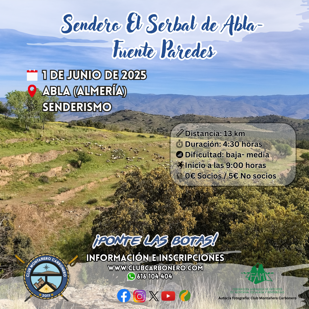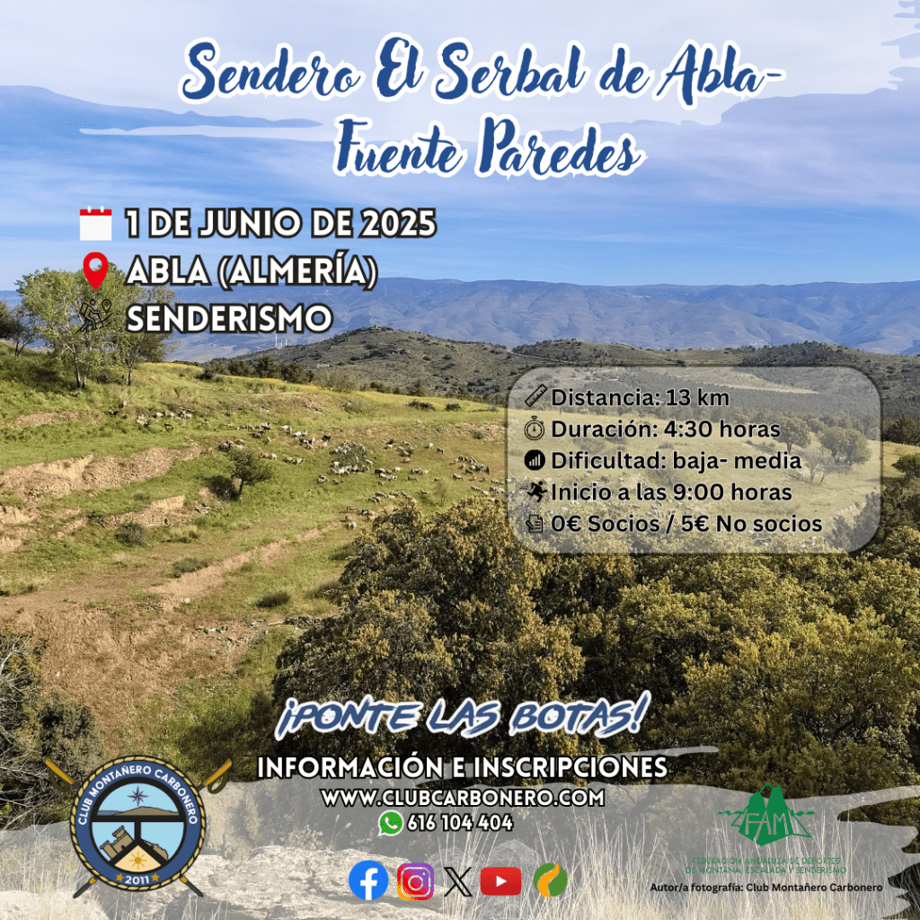 El Club Montañero Carbonero organiza el domingo 1 de junio de 2025 la ruta de senderismo El Serbal de Abla-Fuente Paredes.