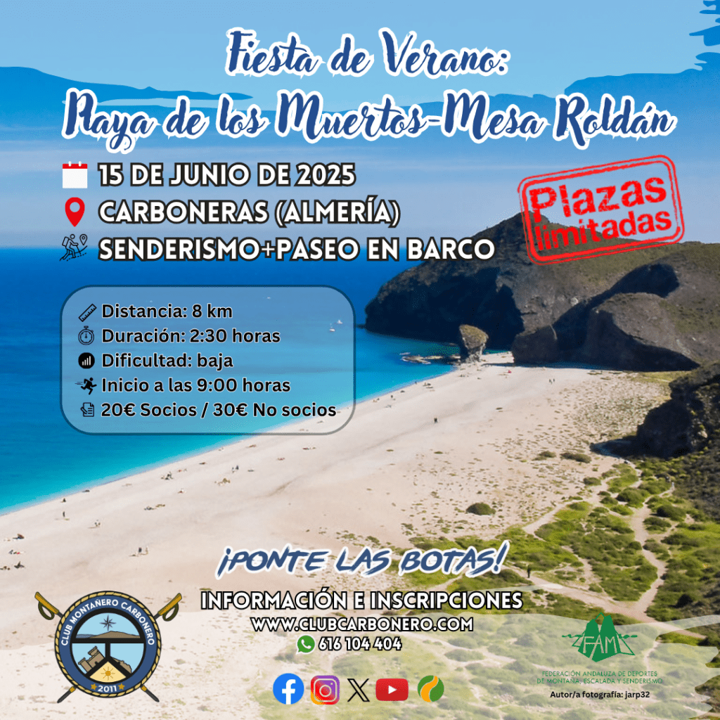 El Club Montañero Carbonero organiza el domingo 15 de junio de 2025 su Fiesta de Verano 2025 que incluye la ruta de senderismo Playa de los Muertos-Mesa Roldán y un paseo en barco entre Carboneras y la Cala del Plomo.