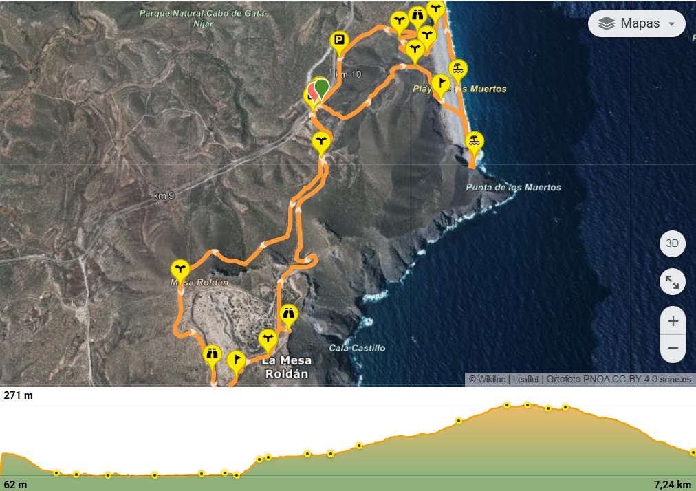 Ruta de senderismo circular con inicio en el Punto de Información de la Playa de los Muertos. Arrancaremos con una subida por un sendero que bordea Mesa Roldán hasta alcanzar la Torre de Mesa Roldán y el Faro. Una vez en este último descendemos por la pista de asfalto hasta el Punto de Información de la Playa de los Muertos y bajamos a la playa por uno de los senderos. Una vez en la arena, iremos hasta la Cala del Peñón Cortao. Haremos allí una parada. Reanudamos la marcha y caminamos por toda la orilla hasta el otro extremo de la playa. Subiremos por unas escaleras hechas en la roca hasta un mirador y desde allí atravesaremos un sendero hormigonado que nos llevará al Punto de Información donde daremos por concluida la ruta.