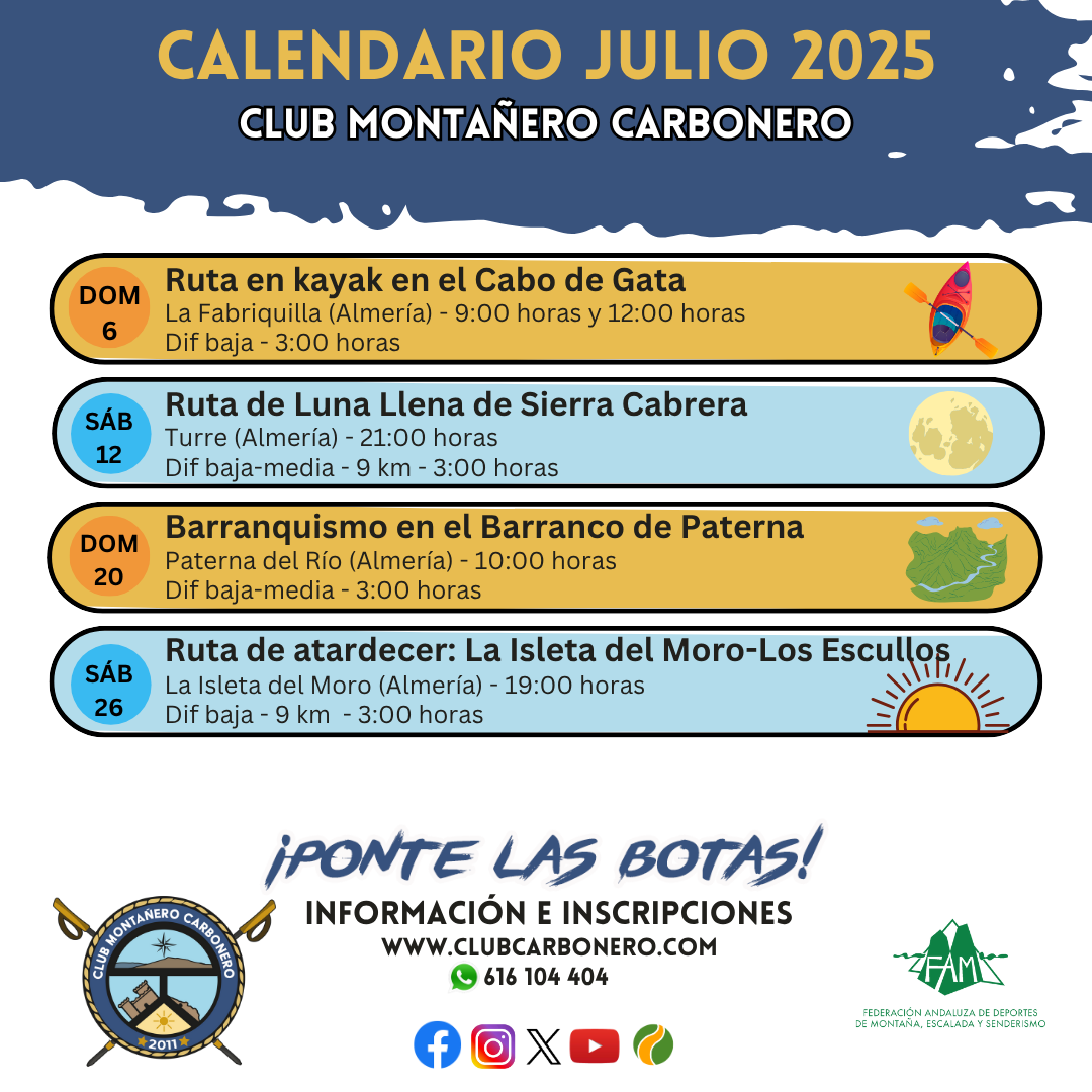 Desde el Club Montañero Carbonero queremos informar del calendario de actividades para el mes de julio de 2025.