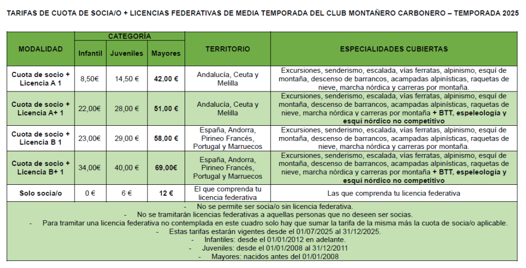 El Club Montañero Carbonero abre su campaña de socias y socios correspondiente a la Media Temporada 2025. La Federación Andaluza de Deportes de Montaña, Escalada y Senderismo (FADMES) permite la tramitación de algunas modalidades de licencias federativas desde el día 25 de junio de 2025 en formato de media temporada que estarán vigentes desde el día 1 de julio de 2025. Estas tienen un coste económico inferior con respecto a las de temporada completa. Y el Club Montañero Carbonero va a adaptar su cuota de socia/o a un importe proporcional a la altura de la temporada en la que nos encontramos.