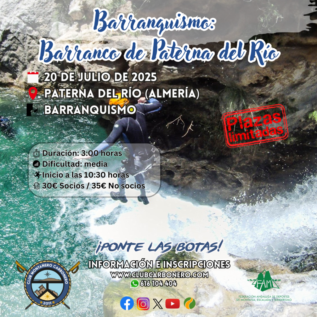 El Club Montañero Carbonero organiza el domingo 20 de julio de 2025 una actividad de barranquismo en el Barranco de Paterna del Río.