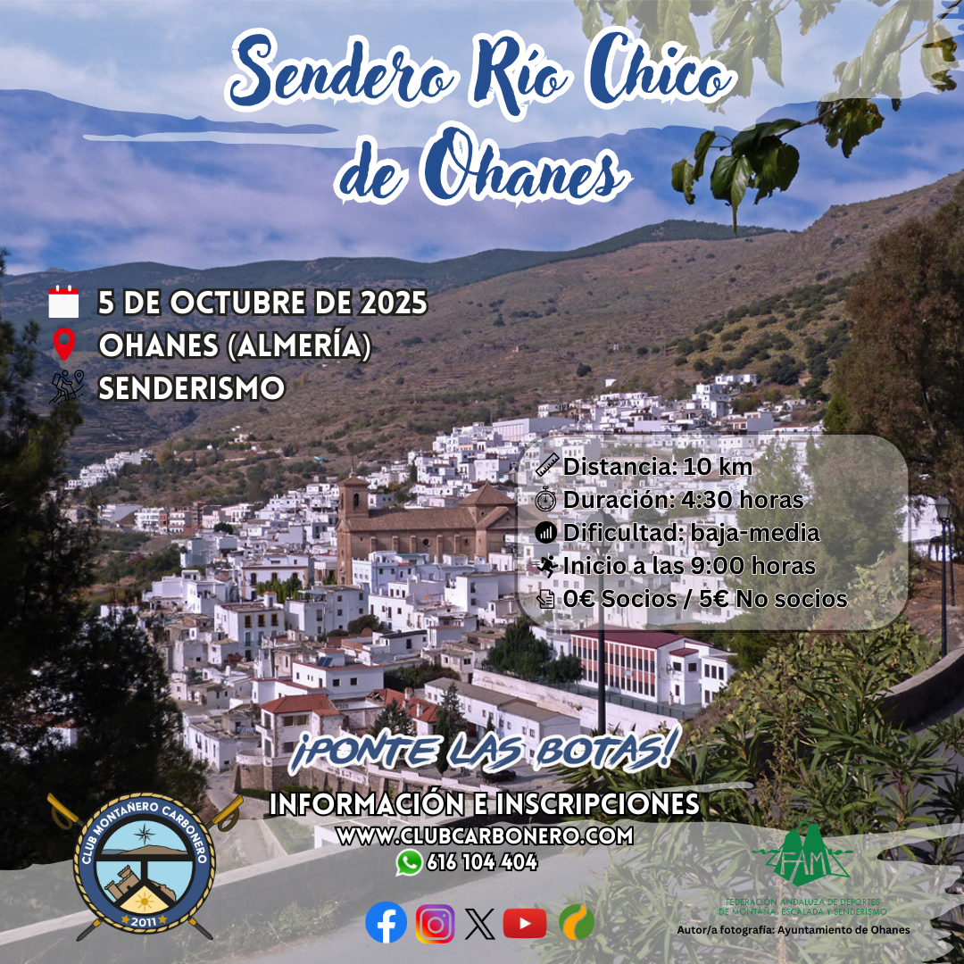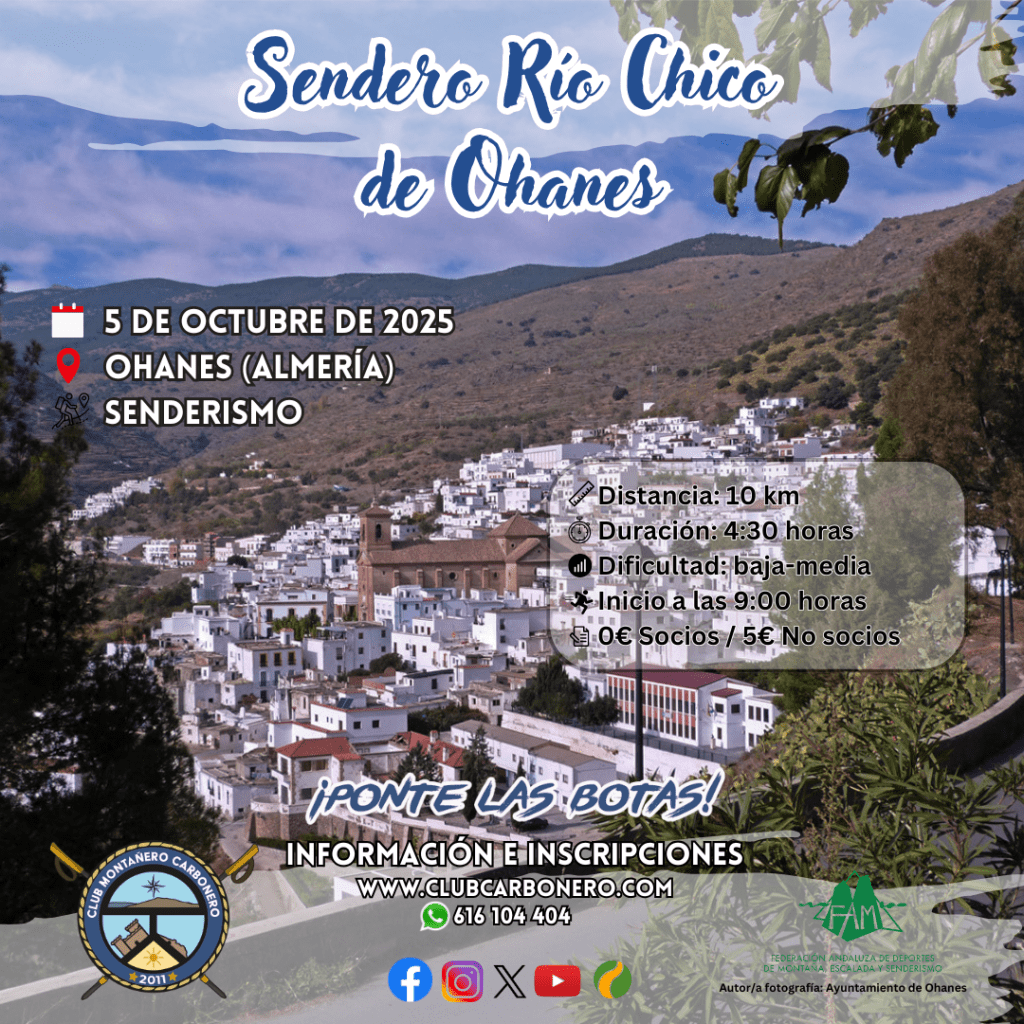 El Club Montañero Carbonero organiza el domingo 5 de octubre de 2025 el sendero Río Chico de Ohanes.