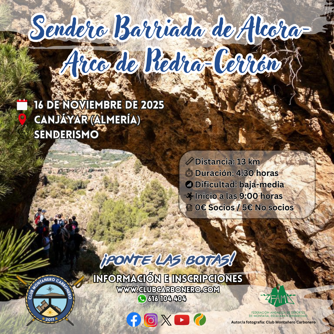 El Club Montañero Carbonero organiza el domingo 16 de noviembre de 2025 el sendero Barriada de Alcora-Arco de Piedra-Cerrón.